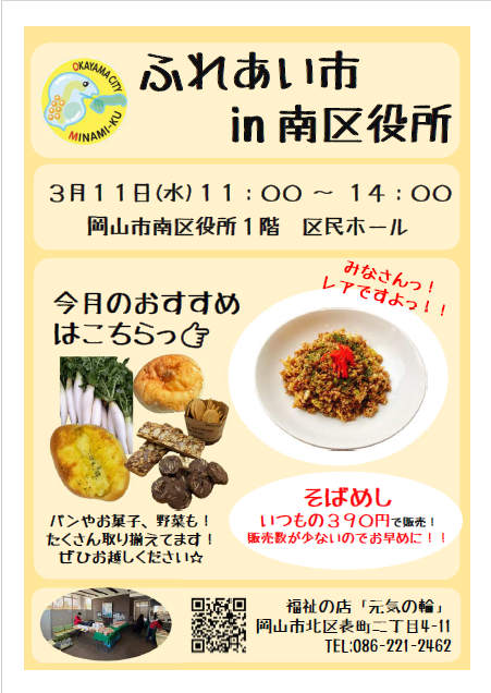 - 3月4日(水) 岡山市役所ふれあい市を開催します。